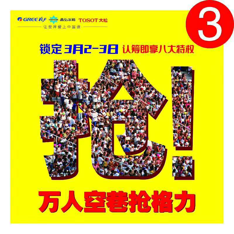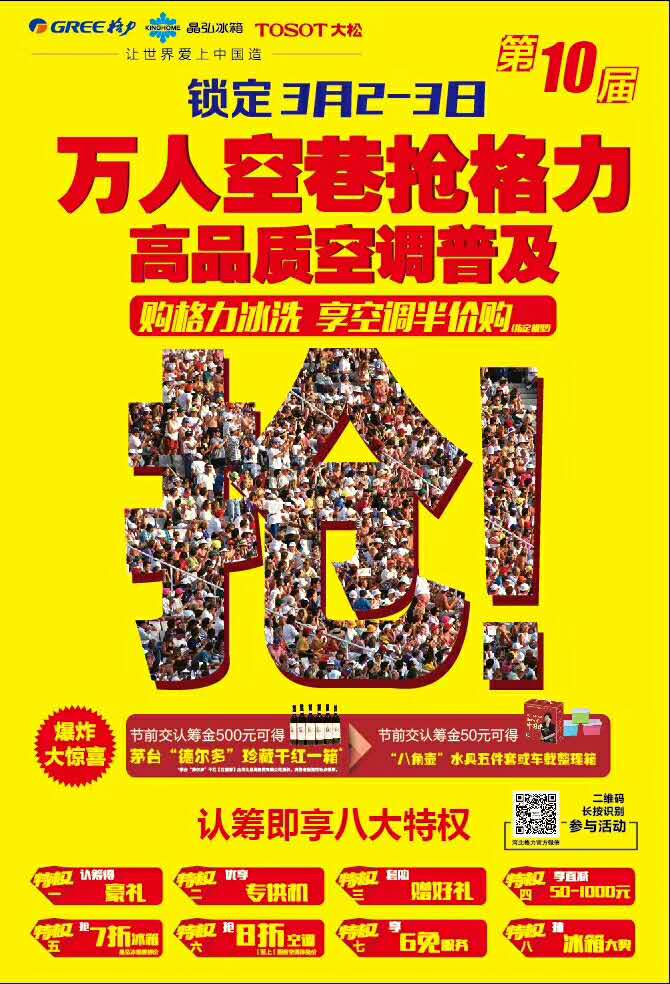 “万人空巷抢格力”是格力原创的年度促销盛惠,是家电行业的促销活动样板. 其特点:时间短、价格低、购买需要先认筹、先认筹先购买,如同电商双十一、双十二,备受市场和消费者喜爱。自2009年以来,每一次“万人空巷抢格力”活动都空前成功。