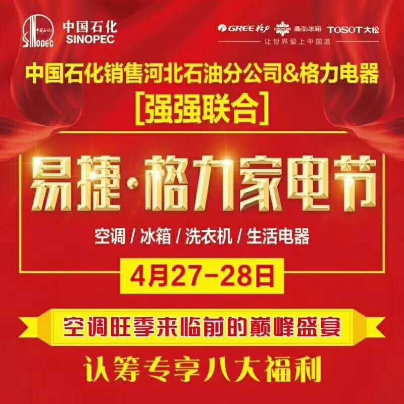 中国石化易捷·格力购物节将于4月27日至28日在石家庄市欧洲产业园举行,(石家庄市南三环裕翔街南行800米路东),这将是在今年空调旺季来临前的最后一场巅峰盛宴。活动期间,消费者可享受家用空调内部专享价和超低价的生活电器惊爆机;购买格力晶弘魔法冰箱,享五折格力洗衣机;购任意格力空调+格力晶弘魔法冰箱可直降800元;购买格力晶弘爆款产品、格力净水、格力烟机灶具等产品也将直降近千元。