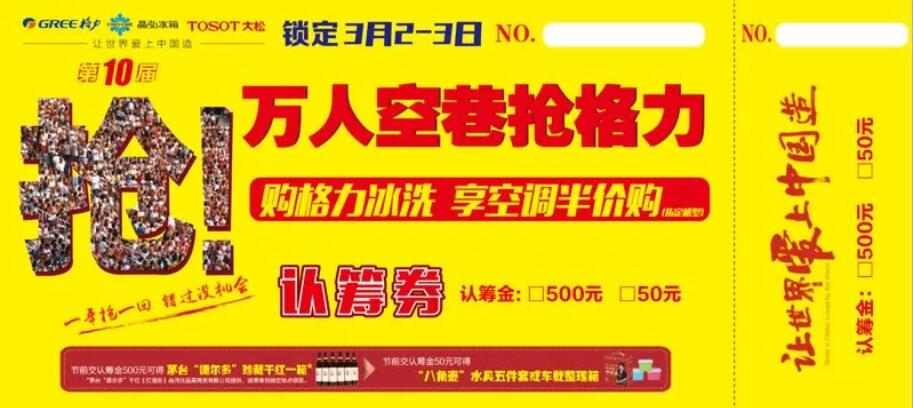 “万人空巷抢格力”是格力原创的年度促销盛惠,是家电行业的促销活动样板. 其特点:时间短、价格低、购买需要先认筹、先认筹先购买,如同电商双十一、双十二,备受市场和消费者喜爱。自2009年以来,每一次“万人空巷抢格力”活动都空前成功。