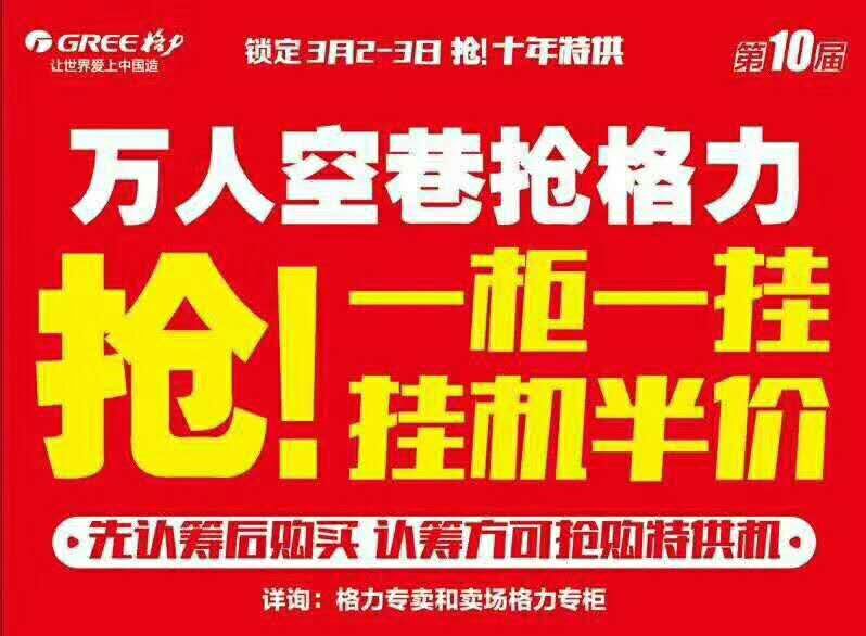 “精明的消费者都知道:万人空巷活动买空调最省钱!”据介绍说,今年“万人空巷抢格力”,格力将拿出从未有过的力度,价格可谓是回到十年前,除了全年最底价,同时还承诺“差额双倍返”“全年保价”,给予消费者最大的优惠和让利,错过这一次,多花2个月工资不止。