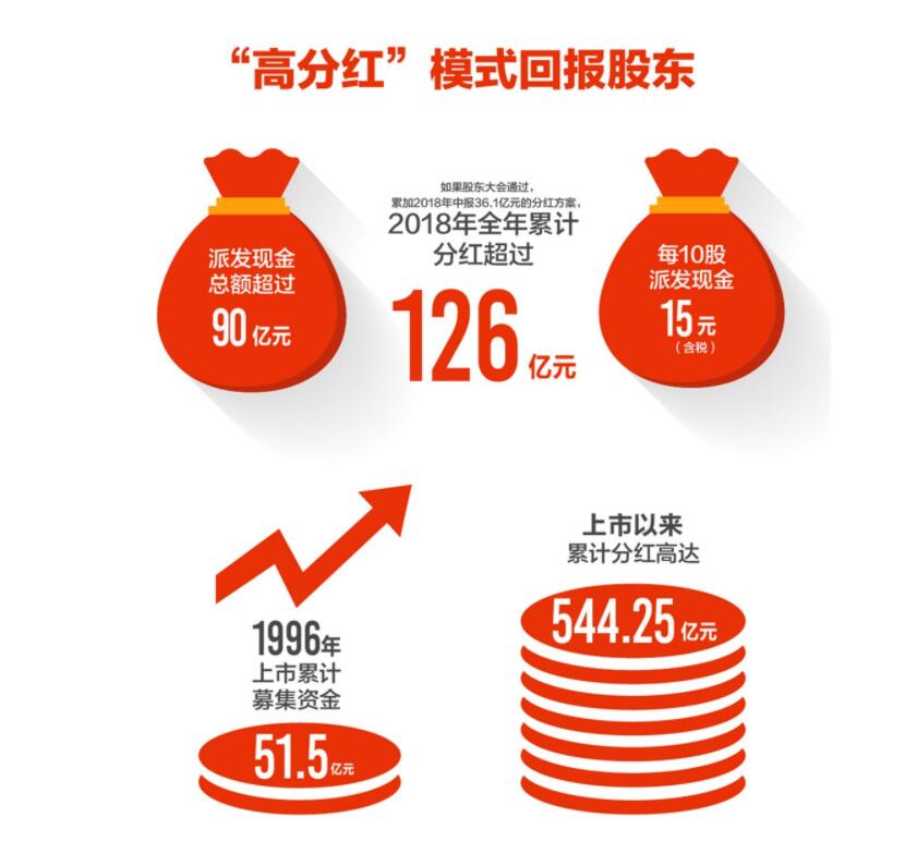 值得一提的是,格力电器公布的2018年度利润分配预案,计划向全体股东每10股派发现金15元(含税),若股东大会通过,格力将正式回归“高分红”模式,慷慨派出超90亿元“大红包”,累加2018年中报36.1亿元的分红方案,2018年全年累计分红超过126亿,刷新公司历年最高分红记录。自1996年上市以来,格力共募集资金51.5亿元,至今累计分红将高达544.25亿元,“最慷慨上市公司”“最具投资价值白马股”可谓实至名归。