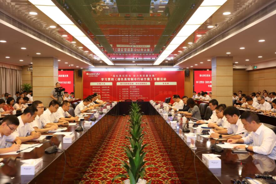 为率先积极响应七部委联合印发的《绿色高效制冷行动方案》(以下简称《方案》),充分认清使命责任,严格树立标准要求,认真抓好执行落实,倡导树立行业新风,6月17日下午,格力电器组织开展“强化责任担当 助力高质量发展”——学习贯彻《绿色高效制冷行动方案》专题活动,格力电器董事长兼总裁董明珠出席并讲话,公司全体领导、相关职能部门和单位代表参加。